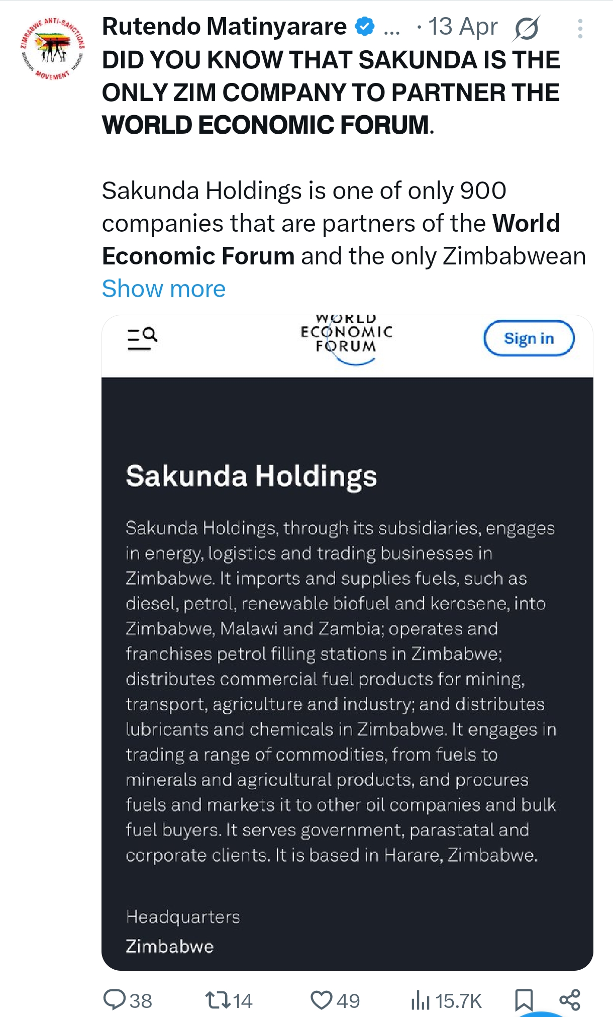 This elite alignment has led to the systemic erosion of Zimbabwe’s sovereignty. The country’s economic framework is now entirely beholden to neoliberal orthodoxies imposed by foreign capital. The $3.5 billion compensation agreement to dispossessed white farmers, despite their historical role in land seizure,was not merely a conciliatory gesture; it was a symbolic act of subservience to Western financial interests. Zimbabwe’s economy, which should be focused on land and resource self-determination, has instead morphed into a rentier system controlled by a handful of oligarchs like Tagwireyi and his Sakunda Holdings empire. These individuals not only siphon wealth but act as intermediaries between global capital and the state, effectively auctioning Zimbabwe’s resources to the highest bidder. I certainly got spooked after Rutendo Matinyarare started glorifying M23 rebels, a globalist funded group, and all about colonialists controlling Congo’s resources. He then tweeted support for Kuda Tagwireyi for President, then Sakunda Holdings for being the only partner of WEF in Zimbabwe. He has been promoting Scott Sakupwanya of the “gold mafia”; he has also previously marketed Kuvimba House and Mutapa Investment Fund (MIF) . Do you see the picture here, whether its M23 rebels or MIF, its about mineral and resource control. I am not an investigative journalist, but if any do read my article, stop wasting energy on Victoria Falls road or pot holes, dig into WEF and globalist capture of Zimbabwe, effectively a backdoor recolonisation. The country has been handed back to the colonialists.