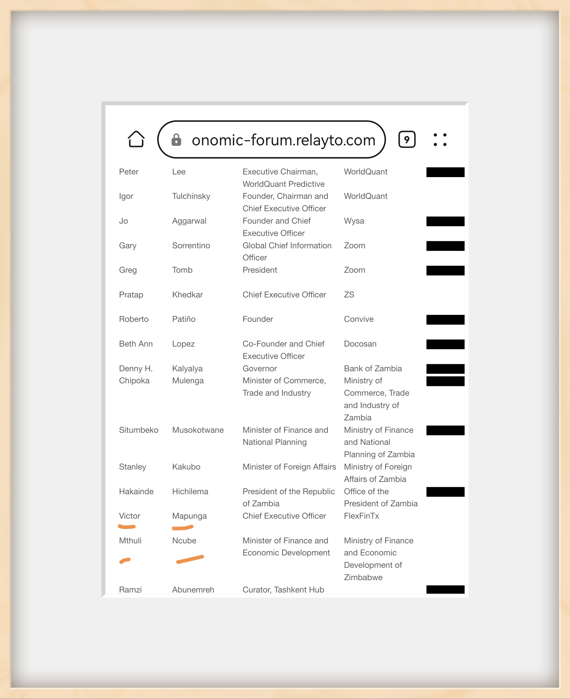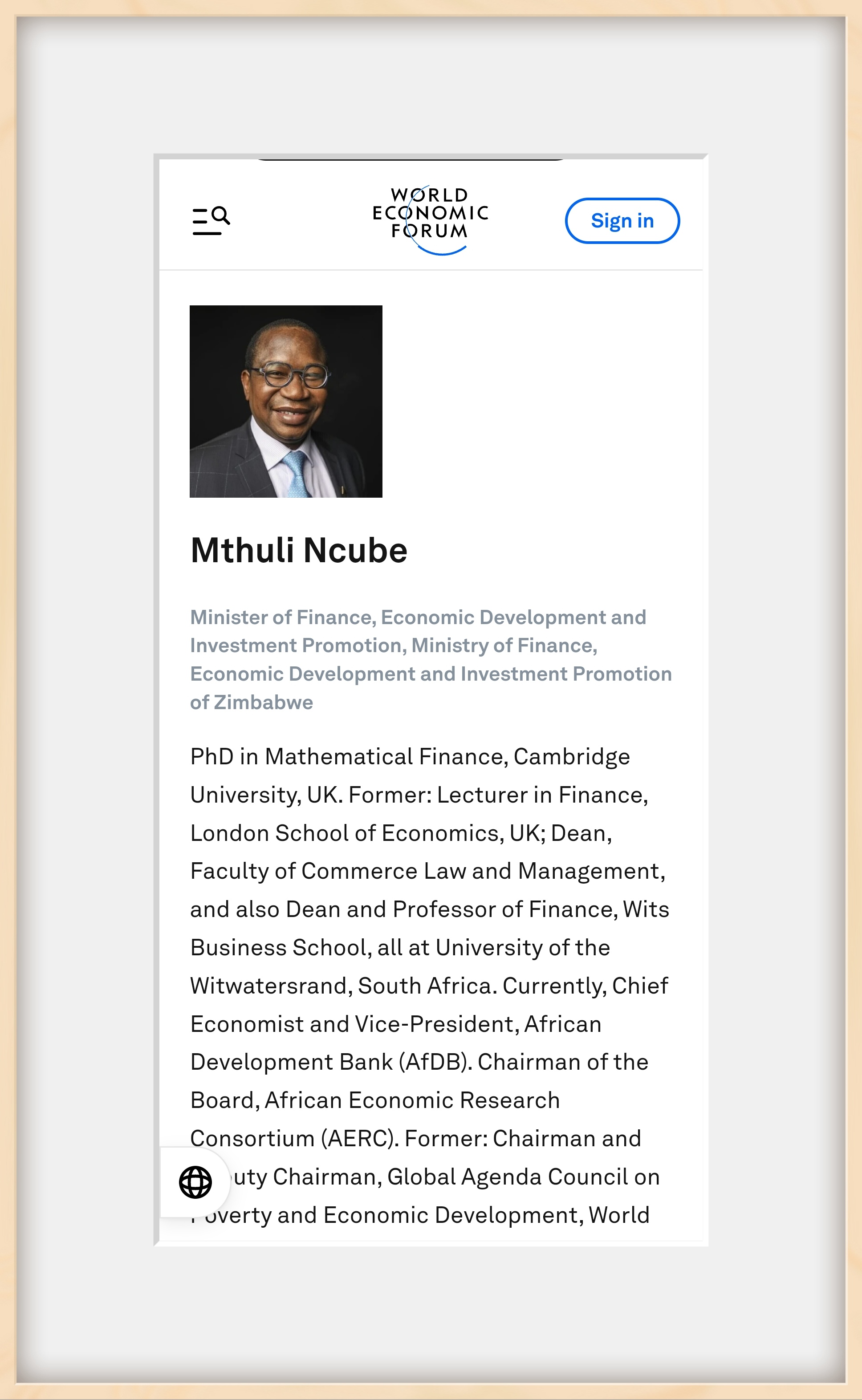 Mthuli Ncube, the Finance Minister is an alumni and member of member of the WEF, so is Lindelwe Lesley Ndlovu, Vice Chairperson, Mutapa Investment Fund and Sakunda Holdings is a partner of this organization. So the WEF is at the heart of Zimbabwe’s finance, economy and resources. Guess whose PhD thesis was about land reform? Simbarashe Moyo, from WEF young global leaders program, his thesis title, “A Failed Land Reform Strategy in Zimbabwe: The Willing Buyer, Willing Seller. Are you surprised Mnangwagwa reversed the land reform programme? Look at the background of Simbarashe Chinyemba, former CEO of Kuvimba Mining House (KMH),now Chief Investment Officer of Mutapa Investment Fund. George Guvamatanga was CEO of a globalist institution with a very dark history on humanity, Barclays Bank. Every puppet African government has these groomed sell-outs holding the highest of offices. Go on the WEF’s website and see who from your country or goverment is or has been through this corrupt pipeline.