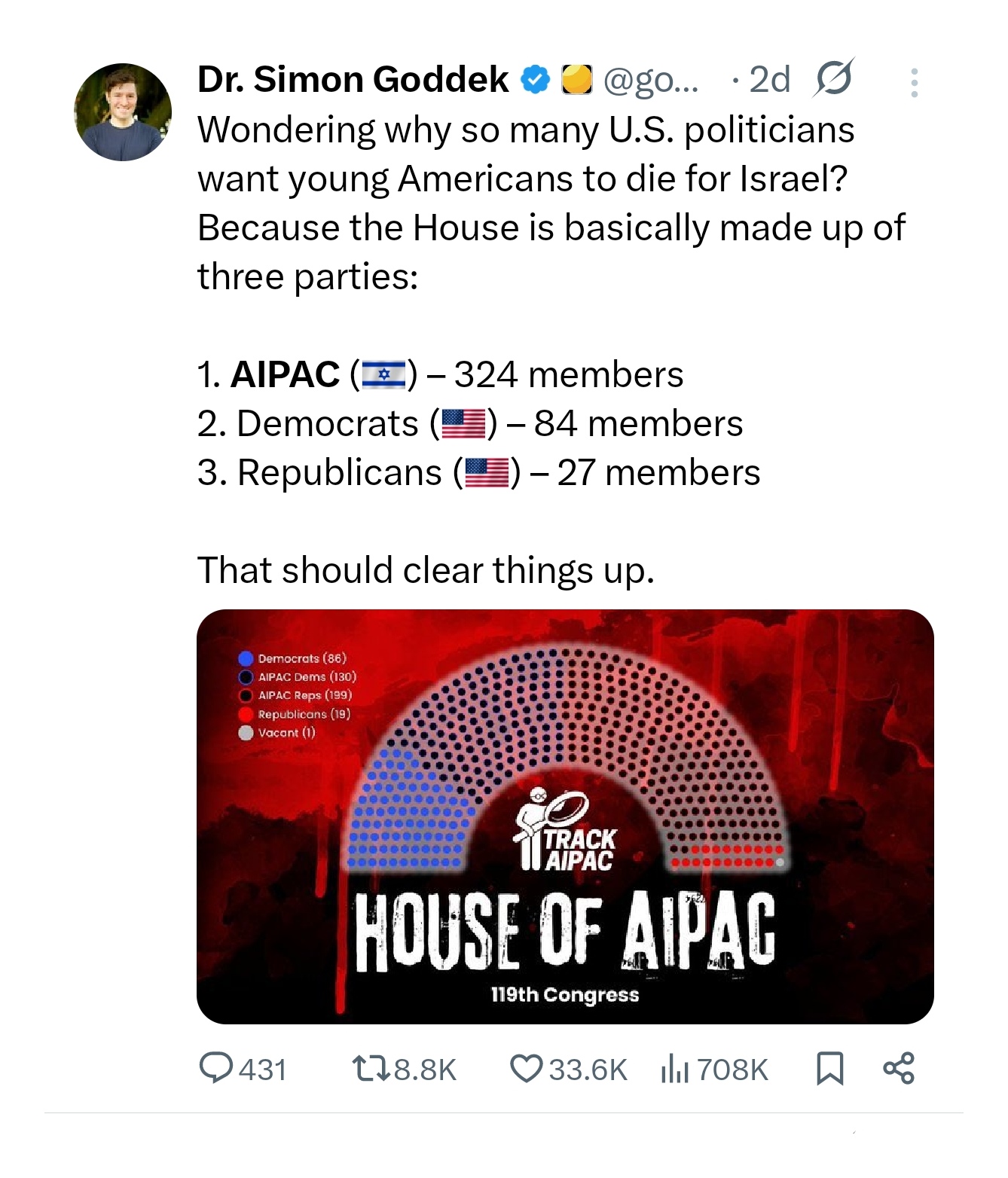 AIPAC is more than just a lobby group. Its clearly a political force with foreign priorities and domestic dominance. Until “they the people” reckon with that reality, the American people will remain second-class citizens in their own “democracy” ( in the way we are made to understand it, not the reality) governed by representatives who answer not to them, but to a foreign-backed political machine.