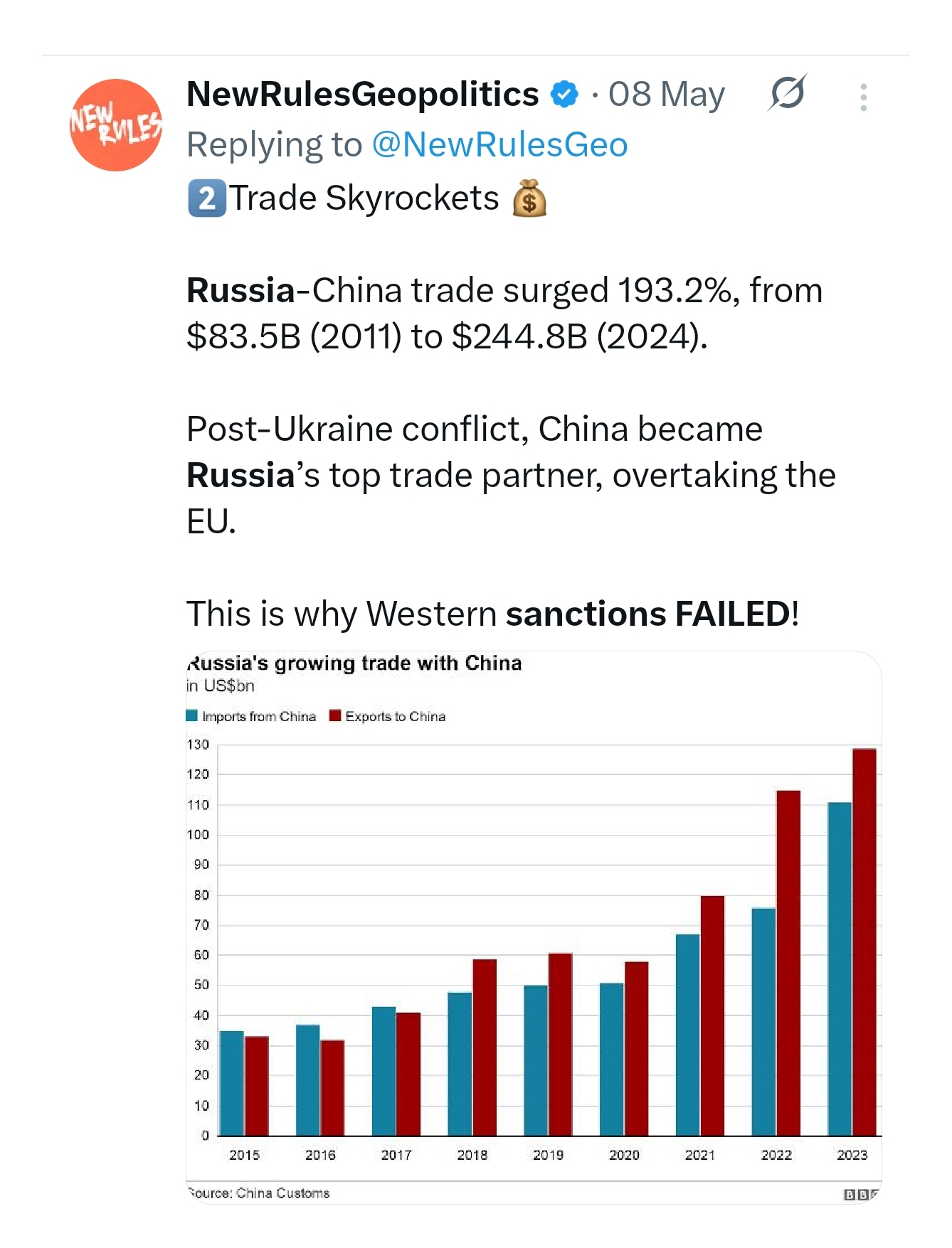 Germany and France, both dependent on Russian energy prior to 2022, now import higher quantities of liquefied natural gas at greater cost. Their reliance on alternative energy sources has not solved the underlying supply problem. It has increased expenditure and industrial vulnerability. Sanctions have hurt Western economies while forcing Russia to diversify its customer base. Russian exports to China have doubled since 2021. Exports to India have grown by a factor of ten. New trade corridors and bilateral payment agreements have been established with countries not participating in the sanctions regime, including Turkey, Iran, and others. Russia has replaced Western dependence with a calculated broader geopolitical alignment. The political expectation was that sanctions would isolate the Kremlin internationally, that result has not been achieved. Instead, Russia has accelerated cooperation with China, Iran, and other states pursuing economic independence from Western institutions. Joint strategies now include de-dollarisation, currency swaps, and alternative banking systems. These developments reduce exposure to the U.S. dollar and bypass the SWIFT system. New trade networks are being constructed outside Western control, a realignment without ideological or structural connotations. Countries outside the Western bloc have identified a shared interest in avoiding dependency on politically controlled financial systems.