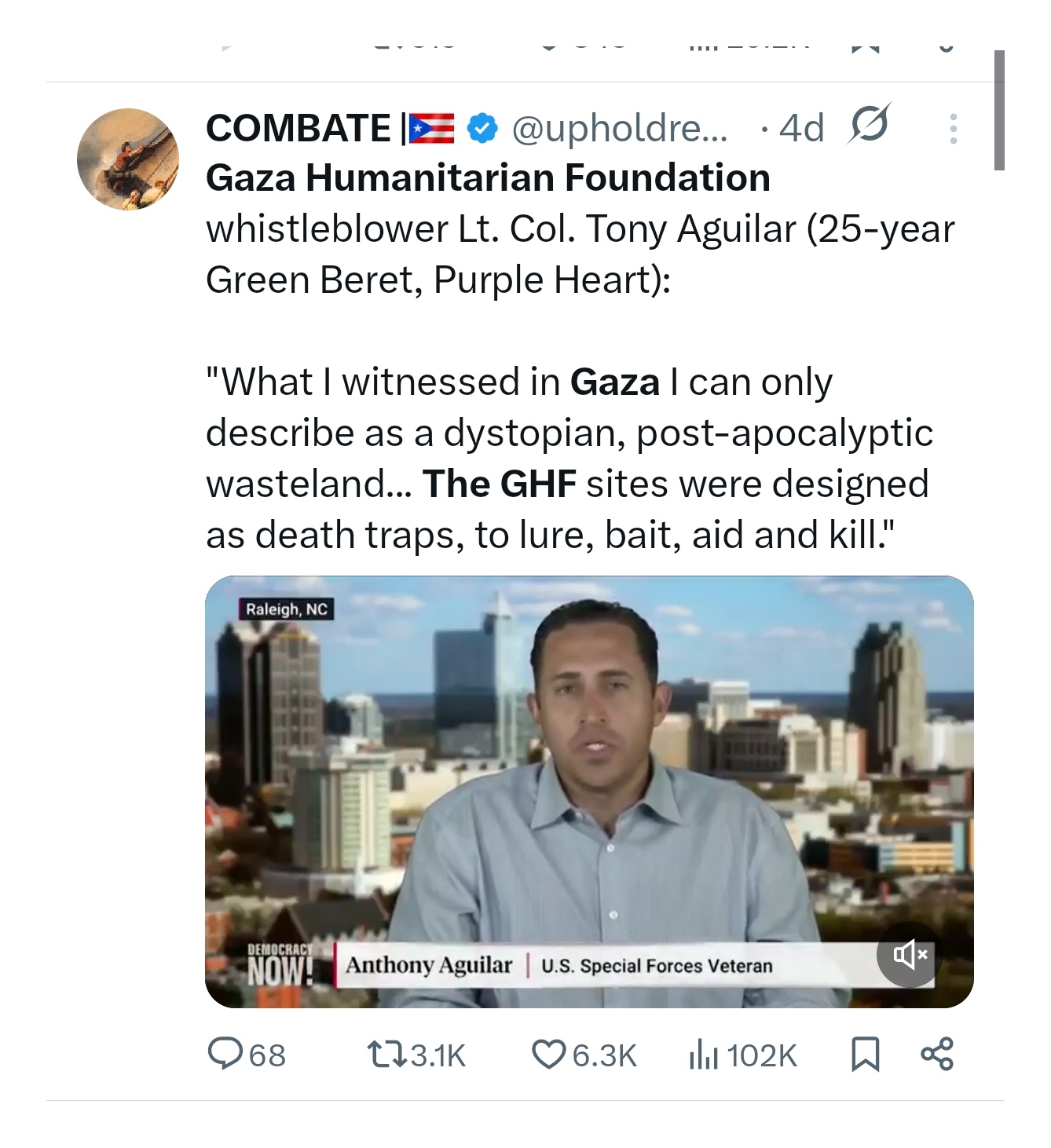 Tucker Carlson interview of Lieutenant Colonel Tony Aguilar was explosive. He was a credible first hand source, a recently retired officer from the United States Army with 25 years of active duty, who was employed by UG Solutions in May 2025. His assignment involved overseeing security operations for the Gaza Humanitarian Foundation (GHF), a new entity replacing United Nations-led relief systems. Aguilar accepted the position on the basis of humanitarian duty. Upon arrival, he encountered logistical arrangements and operational conduct that contravened established international legal frameworks.