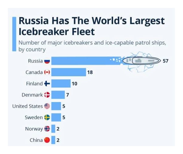 Russia planned and built for an Arctic opening long before commercial traffic increased, and that preparation explains its present advantage. The Russian state controls the largest share of coastline bordering the NSR, has invested in port modernisation at Murmansk and other hubs, and continues to expand state services for navigation, rescue, and environmental monitoring that underpin regularised shipping. Rosatom and state operators now claim operational oversight of ice reports, traffic control and merchant support along the corridor, and their programme of nuclear and conventional icebreaker construction remains unmatched by any single rival.