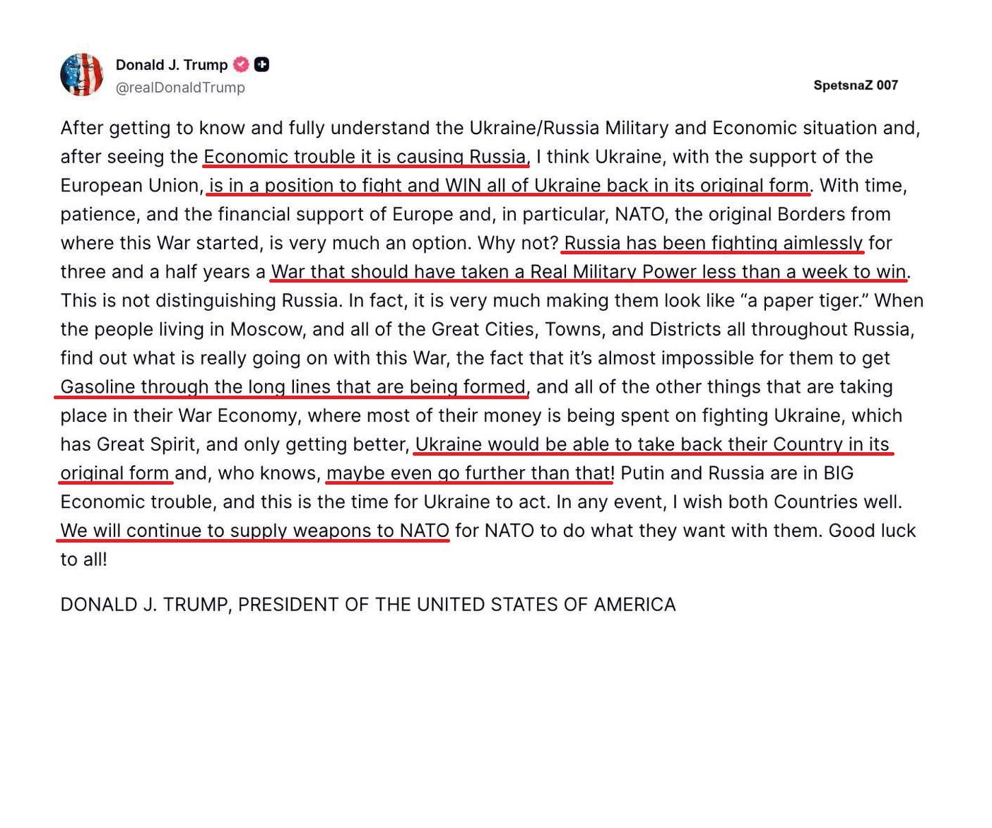 (Trump:“Russia might just be a paper tiger. They’re killing 7,000 people a week, for nothing. Most of you have probably seen the statement I released recently. I’m glad you did, because I meant every word. Let Ukraine take back their land.”)
