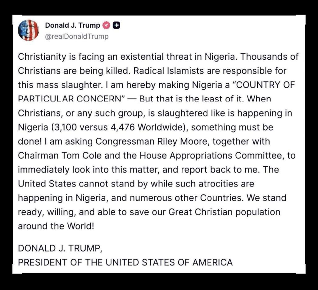 America ignores massacres in Sudan, Syria, Lebanon, and Palestine but suddenly wants to “save” Christians in Nigeria.
