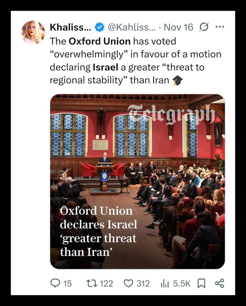 The Oxford Union voted that “Israel is a greater threat to regional stability than Iran” by an overwhelming majority of 265 to 113. Last year, the Union also voted that “Israel is an apartheid state responsible for genocide” by an overwhelming majority of 278 to 59. The vote therefore reflected a clear assessment rather than ideological bias. Students weighed extensive records of Israeli cross-border action, nuclear policy, occupation practices and expansionist strategies against Neuer’s broad claims regarding Iran and concluded that Israel poses the greater regional danger. Their decision aligned with decades of independent research across history, security studies and international law, forming a judgement grounded in evidence rather than sentiment or political pressure.