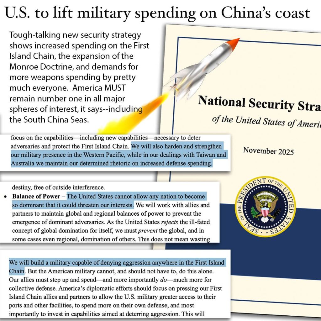 This operational reality clarifies the shift visible in the new strategy’s geopolitical priorities. The document abandons any serious attempt to fight and win a high-intensity war in East Asia while reframing deterrence as offshore militarisation financed increasingly by regional allies. Japan, Taiwan, the Philippines, and Australia appear less as partners than as terrain and buffers within a containment lattice. The demand that first island chain participants pay materially and politically for their inclusion reflects this recalibration. Washington retains command authority while externalising cost, risk, and exposure. America’s insistence on remaining number one across all major spheres coexists with an implicit admission that direct military primacy against China is no longer assured. What remains is control of sea lanes, pressure through trade architecture, and narrative maintenance sufficient to justify accelerated arms spending without testing battlefield assumptions.