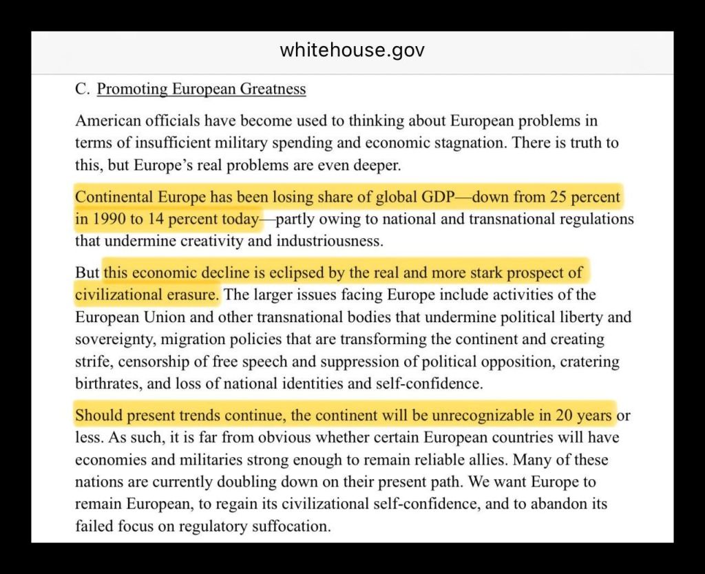 The new United States National Security Strategy reads less like a plan for alliance management and more like a post-mortem delivered in careful bureaucratic language. The document marks a clear break from the post-Cold War assumption that Europe remains the stable core of Western power. It describes a continent in rapid economic contraction, demographic decline, political fragmentation and waning strategic relevance. The language is not that of a rival or critic. It is the language of a patron acknowledging that an asset no longer performs its intended function.