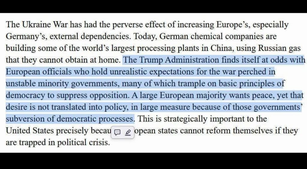 The strategy’s most striking departure lies in its assessment of Europe’s political systems. It explicitly notes that several European governments operate through unstable coalitions that suppress dissent to maintain foreign policy consensus. The document records a widening gap between public opinion and policy on the war in Ukraine, sanctions, and energy costs. Survey data from European polling institutions consistently show majorities favouring negotiations, yet electoral and legal mechanisms increasingly insulate decision-makers from those preferences. The strategy does not frame this as a temporary distortion but as a structural feature of contemporary European governance.