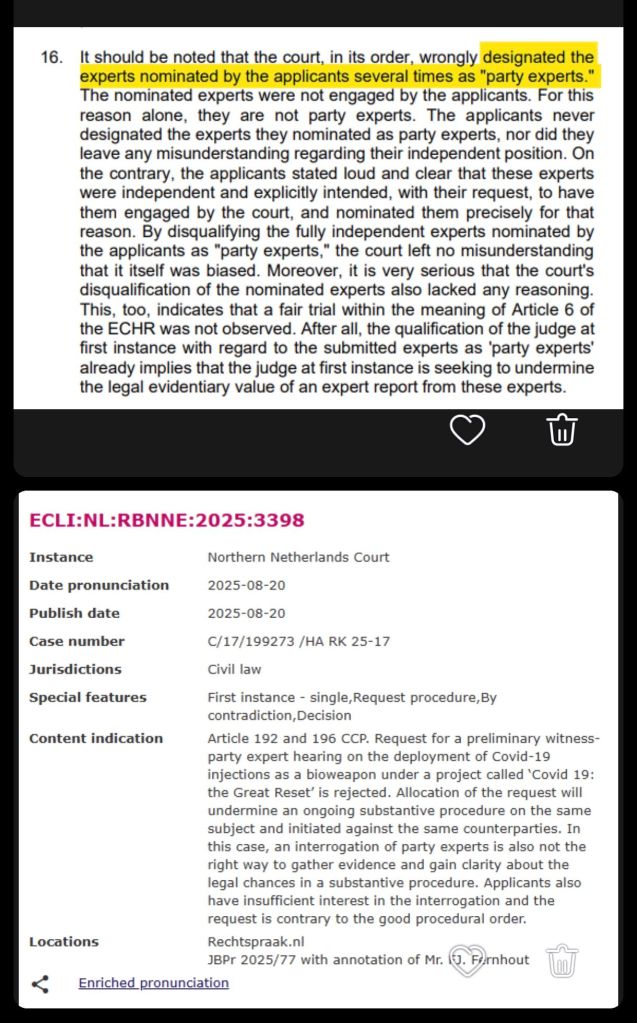 The case arose from a 2023 filing by seven Dutch plaintiffs alleging severe injury following COVID-19 mRNA vaccination, with one claimant dying after commencement of proceedings, and the court has accepted jurisdiction despite the defendants’ objections and attempts to avoid oral testimony.