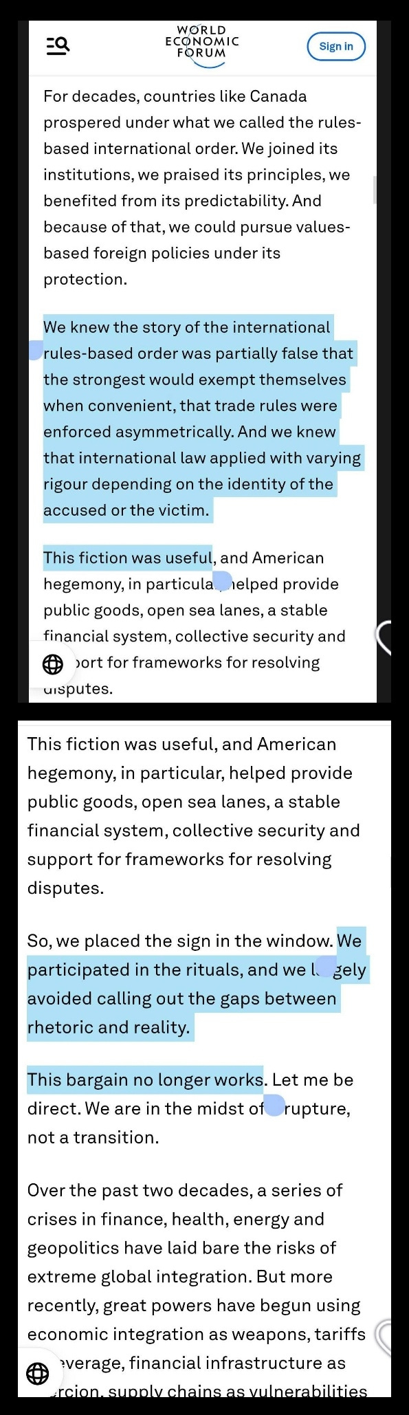 I’m only sorry I don’t have the time to comment in detail, but I can tall you 100% certainty, that Mark Carney’s speech was excellent by political standards, that is, full of lies presented as credible truths. His predecessor was sometimes more direct. For instance, when quizzed about allowing the export of deadly weapons and military vehicles to Saudi Arabia (the Canadian Constitution forbids the sale to warrying countries – what is the artillery made for?) knowing that the Saudis will use them to kill people in Yemen, his candid reply was “my first duty is the welfare of the Canadian people. My choice was between dead Yemeni or leaving thousands of Canadian without a job”. Charming!