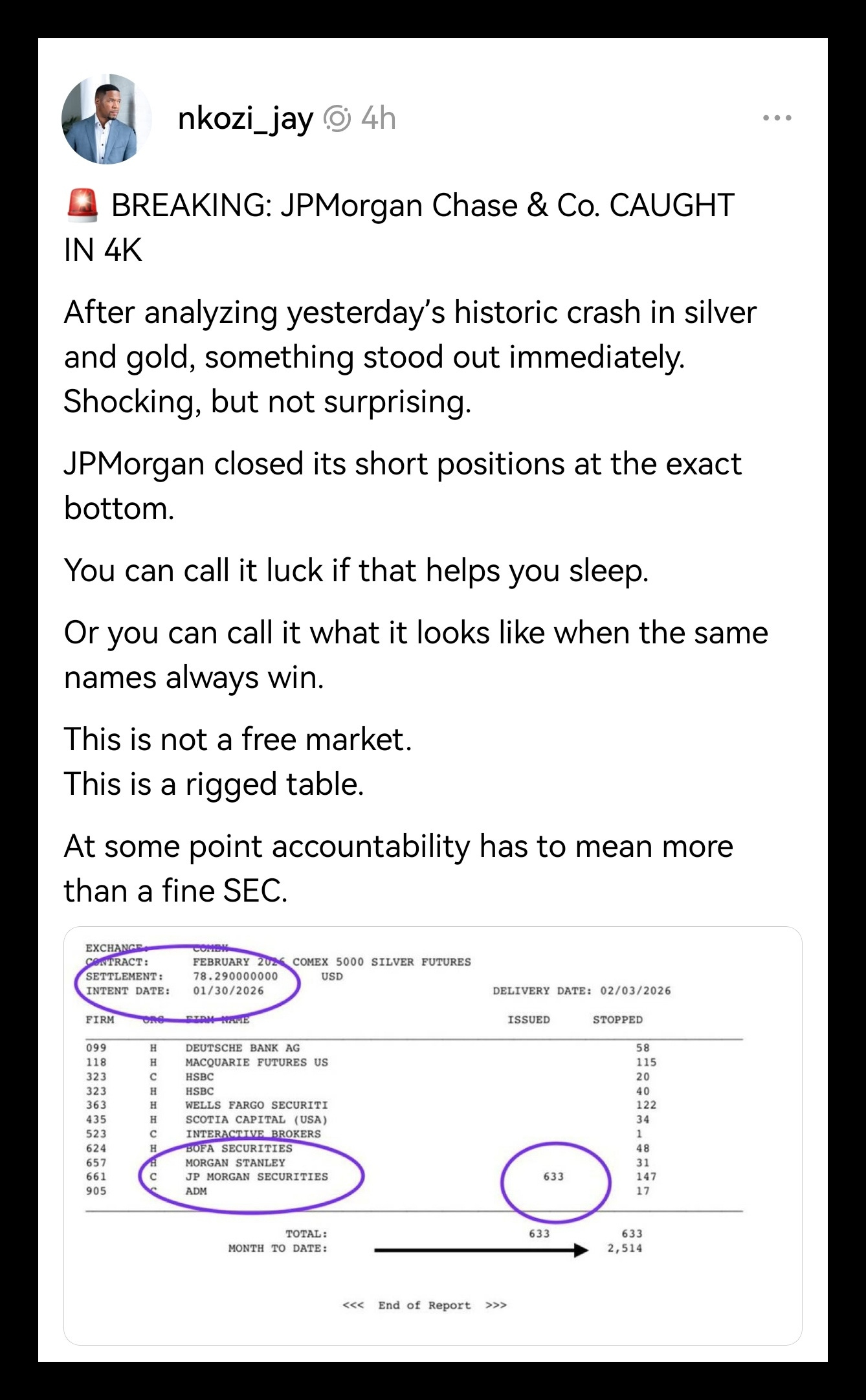 To sum it up, yesterday’s market disruption followed directly from the intervention imposed by the CME Group in December. The margin increases succeeded in reducing leverage, but they did not address underlying physical supply constraints. Subsequent price declines therefore reflect forced liquidation rather than improved market balance.