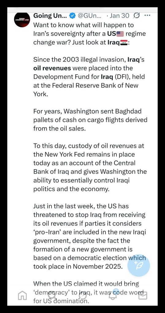 The United States exercises decisive control over Iraq through financial mechanisms established after the 2003 invasion, rather than through formal colonial administration or direct ownership of physical resources, a system Hussein Askary has described as “a complete financial and economic subjugation that survives the end of military occupation.” Control operates through monetary custody, banking compliance, and conditional access to national revenue, rather than visible occupation. Iraqi oil production remains largely operated by Iraqi, Chinese, and Russian companies, yet revenue custody remains externalised and politically conditional, a structure confirmed by former Iraqi oil minister Thamir Ghadhban, who stated that “production was never the issue, access to revenue always was.”