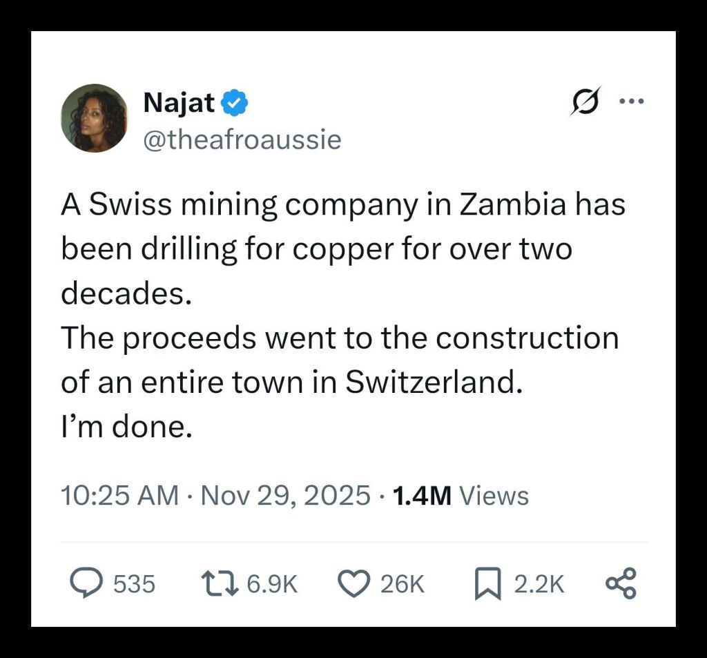 Transfer pricing practices further erode Zambia’s tax base. Copper is frequently sold to affiliated trading entities in low tax jurisdictions at below-market prices, with profits realised downstream in Switzerland or other trading hubs rather than in Zambia. The OECD has acknowledged the scale of base erosion through commodity mispricing, though enforcement remains limited where political leverage is weak. Switzerland plays a central role within this system. A significant proportion of Zambian copper exports are marketed through Swiss commodity trading houses, despite Switzerland possessing no copper mines. In recent years, copper valued at nearly $4 billion originating from Zambia was routed through Switzerland. Swiss unemployment remains near 3 percent, while mining towns in Zambia such as Mufulira experience unemployment exceeding 70 percent, reflecting asymmetrical value chains rather than differences in effort or productivity.