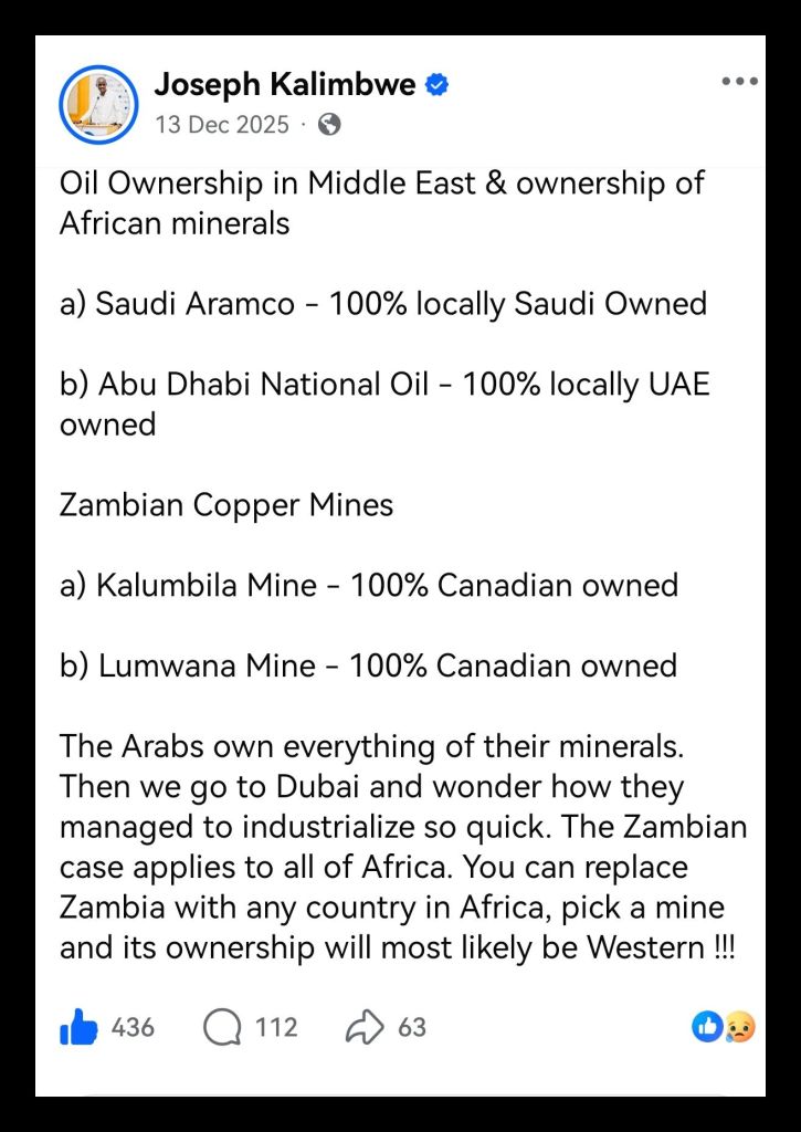 The political economy sustaining this arrangement depends on elite capture within Zambia. Leadership reliant on foreign capital often internalises investor priorities, framing national development in terms compatible with external interests. Political scientist Jeffrey Winters describes this as oligarchic accommodation, where policy stability for capital outweighs distributive outcomes for citizens. Zambia’s post-independence political discourse has focused on basic service provision rather than structural transformation, reflecting constrained fiscal capacity and limited policy autonomy. This stagnation contrasts sharply with oil-producing states in the Arab world. Countries such as the UAE and Saudi Arabia retained sovereign ownership over hydrocarbon resources, negotiated production sharing arrangements, and accumulated national capital through state-owned enterprises. Western states accommodated these arrangements due to geopolitical dependencies and energy security considerations. Zambia and comparable African states were not afforded similar latitude during liberalisation.