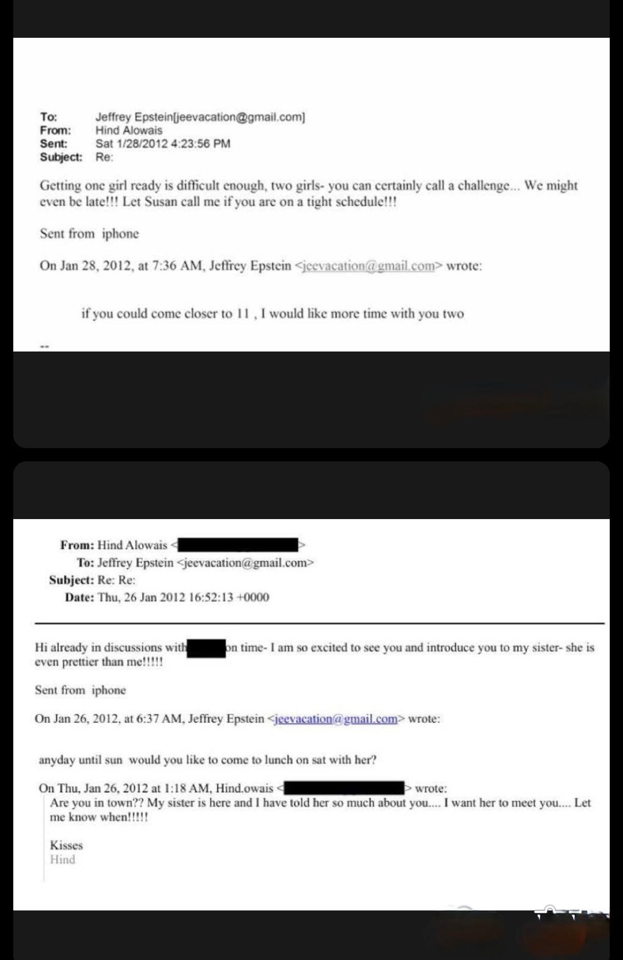 Allegations linking prominent Emirati figures to Jeffrey Epstein moved beyond rumor following the release of documents by the U.S. Department of Justice. The disclosed emails show sustained correspondence between Emirati diplomat Hind Al-Owais and Epstein in 2011 and 2012, including arrangements for meetings with “girls” and references to bringing her younger sister. In one January 2012 exchange, Al-Owais wrote, “Getting one girl ready is difficult enough, two girls, you can certainly call a challenge,” to which Epstein responded by requesting more time with them. In another message she stated, “I am so excited to see you and introduce you to my sister, she is even prettier than me!” DOJ-released calendar entries and email logs reflect repeated coordination. Al-Owais, who has publicly positioned herself as a women’s rights advocate and now serves as Director of the UAE Permanent Committee for Human Rights, appears hundreds of times in the released files.