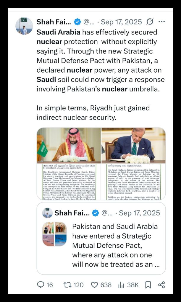 The contemporary Saudi-Pakistan relationship reflects analogous structural drivers. On 17 September 2025 Riyadh and Islamabad signed a strategic mutual defence agreement under which “any aggression against either country shall be considered an aggression against both.” Official statements emphasised joint deterrence and comprehensive military cooperation, and Pakistan’s Defence Minister Khawaja Muhammad Asif publicly stated that Islamabad’s nuclear weapons capabilities “will be made available” to Saudi Arabia under the agreement. Independent analysts note that Pakistan’s nuclear arsenal, estimated at about 170 warheads, makes it the only Muslim-majority state with strategic nuclear capability, and the mutual defence pact effectively places Saudi Arabia under Islamabad’s extended nuclear deterrence umbrella, though neither side has released text explicitly detailing nuclear provisions.