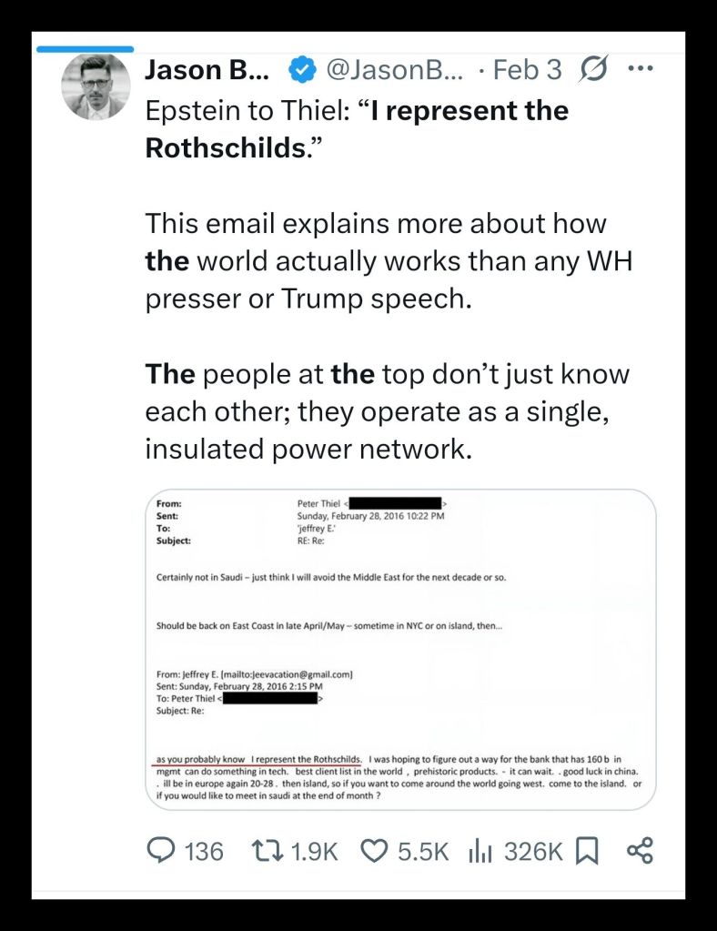 In February 2016 Jeffrey Epstein sent an email to Peter Thiel stating, “As you probably know, I represent the Rothschilds.” That sentence entered the official record of the United States Department of Justice and appeared within the corpus now known as the Epstein Files. Mainstream press institutions declined to treat the statement as a matter of structural importance despite its evidential weight. The files released in January 2026 comprise approximately 3.8 million pages, within which the name Rothschild appears nearly twelve thousand times. The comparative frequency of other prominent political surnames remains materially lower within the same archive. Patterns of editorial omission followed.