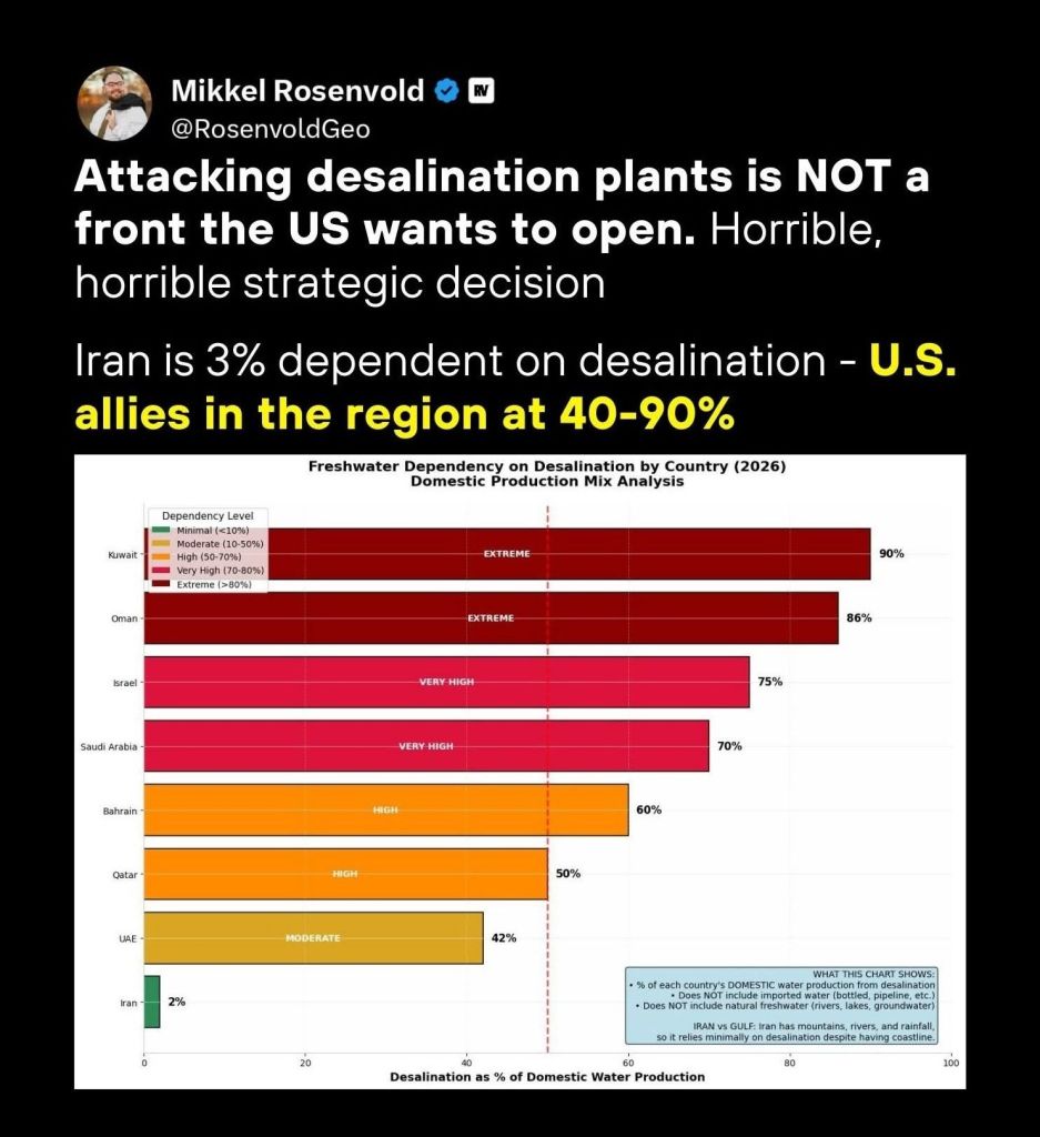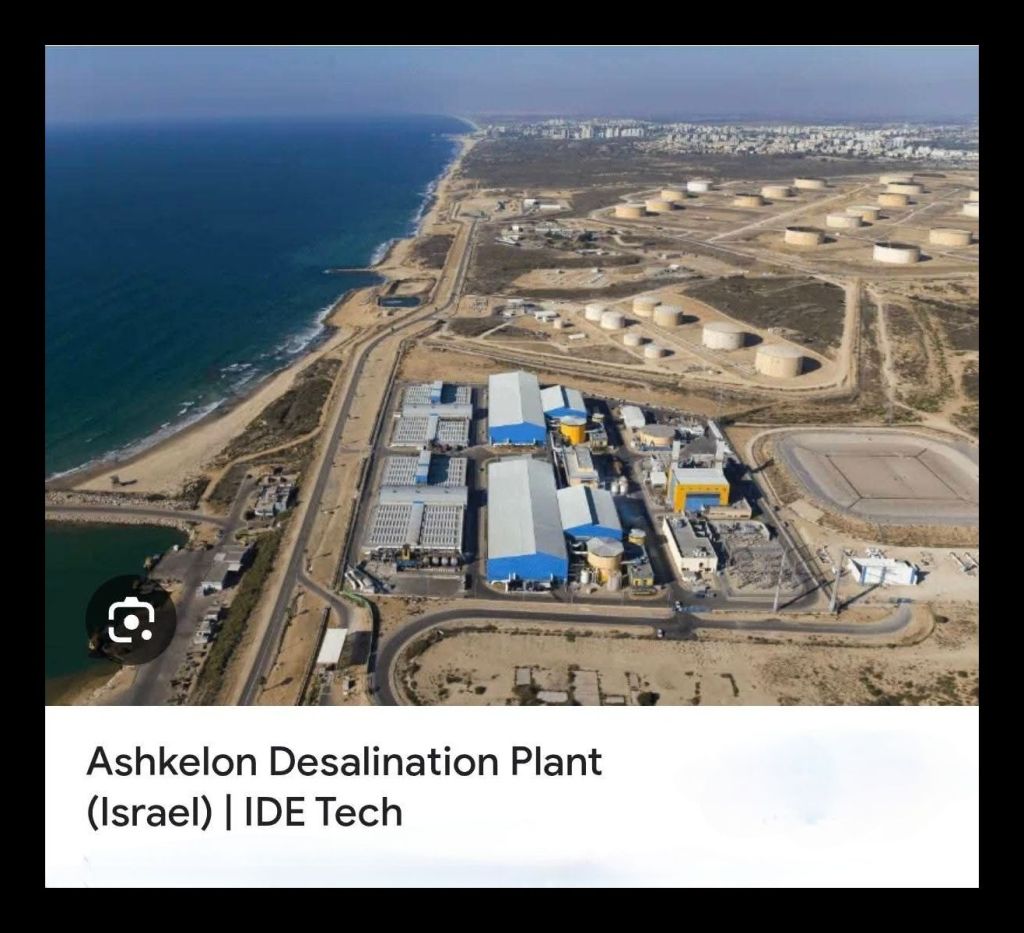 Tehran immediately responded with a statement that the coalition had set a precedent and last night put the Haifa refinery out of service. Israel has five major large-scale seawater desalination plants on its Mediterranean coast. These facilities produce roughly 585–600 million cubic meters of desalinated water per year, supplying around 70–85% of Israel’s domestic drinking water.
