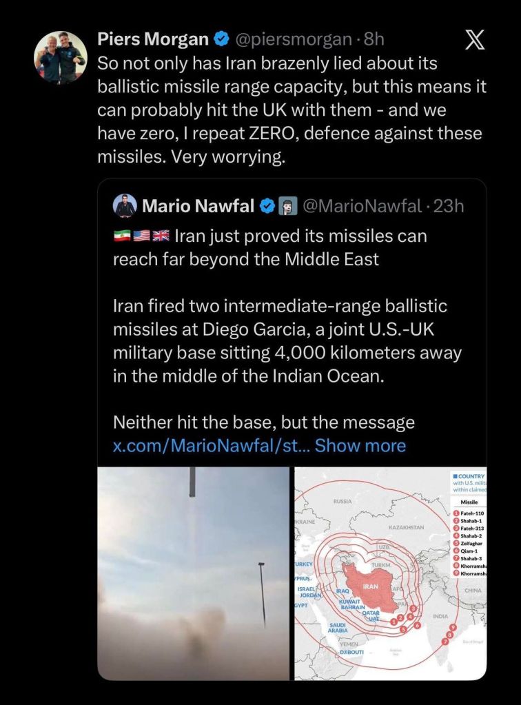 The conduct of the war has followed a discernible pattern in which Iranian actions have progressively expanded both in scale and technical demonstration, producing cumulative strategic effects that were not anticipated within prevailing Western assessments. Early assumptions regarding the limits of Iranian missile capability have been overtaken by operational evidence indicating reach well beyond previously declared thresholds. The reported strike against Diego Garcia, a facility central to United States long-range strike architecture, has introduced a new parameter into strategic planning, given the base’s historical immunity from direct attack over several decades of conflict.