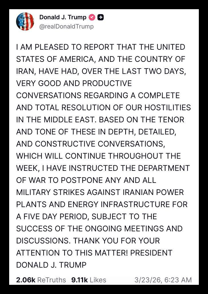 Reuters (2026) Trump postpones strikes on Iranian infrastructure amid market pressure. Available at: https://www.reuters.com/world/trump-postpones-military-strikes-iranian-power-plants-2026-03-23/