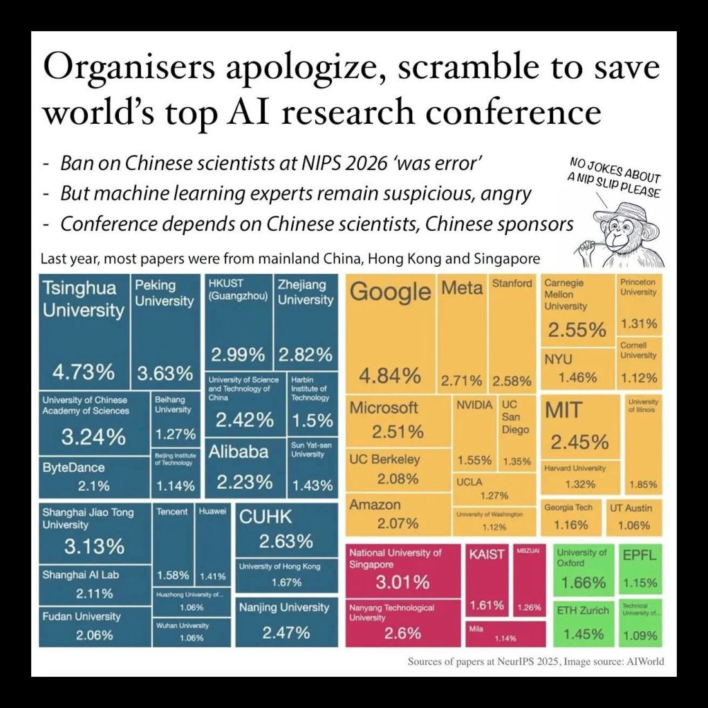 The NeurIPS incident demonstrates how legal compliance decisions, funding dependencies, and geopolitical competition converge within scientific institutions, with the eventual reversal reflecting a late-stage correction after a clear miscalculation of institutional risk. Exclusion parameters captured more than 800 Chinese researchers, many responsible for a substantial share of leading peer-reviewed papers, core review processes, and frontline advances in machine learning, creating conditions under which the conference would have lost functional relevance as a global research forum. Access to publication venues functions as a control point influencing participation, recognition, and ultimately the direction of technological development, while dependence on concentrated contributor bases limits the ability to enforce politically derived restrictions without structural consequences. Continued alignment of scientific infrastructure with national policy frameworks will sustain these pressures, with increasing impact as artificial intelligence becomes more tightly linked to state power, industrial capacity, and strategic competition.