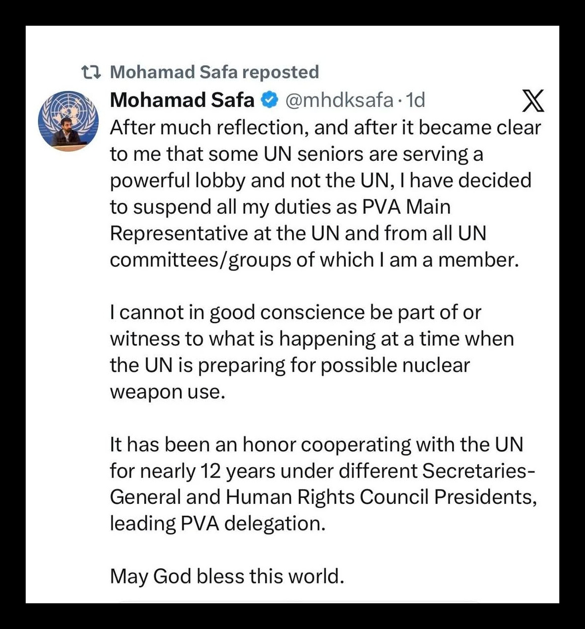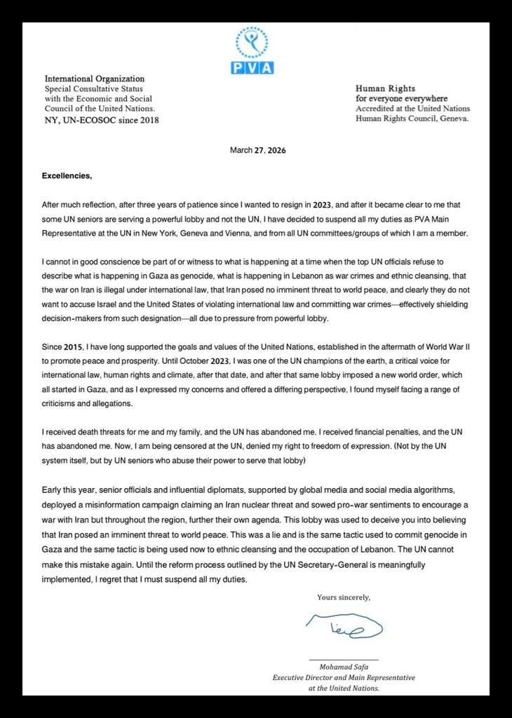 Mohamad Safa, a representative of the Patriotic Vision Alliance at the United Nations, has resigned from his roles while issuing a blunt and deeply alarming accusation: that elements within the UN are preparing for the possible use of nuclear weapons in Tehran. He presents his departure not as a routine resignation but as a moral refusal to remain complicit in what he frames as a potential crime against humanity. After nearly twelve years of involvement across UN committees and leadership cycles, he claims he could no longer justify participation in an institution he now believes is being influenced by what he calls a “powerful lobby” acting against its stated mission.
