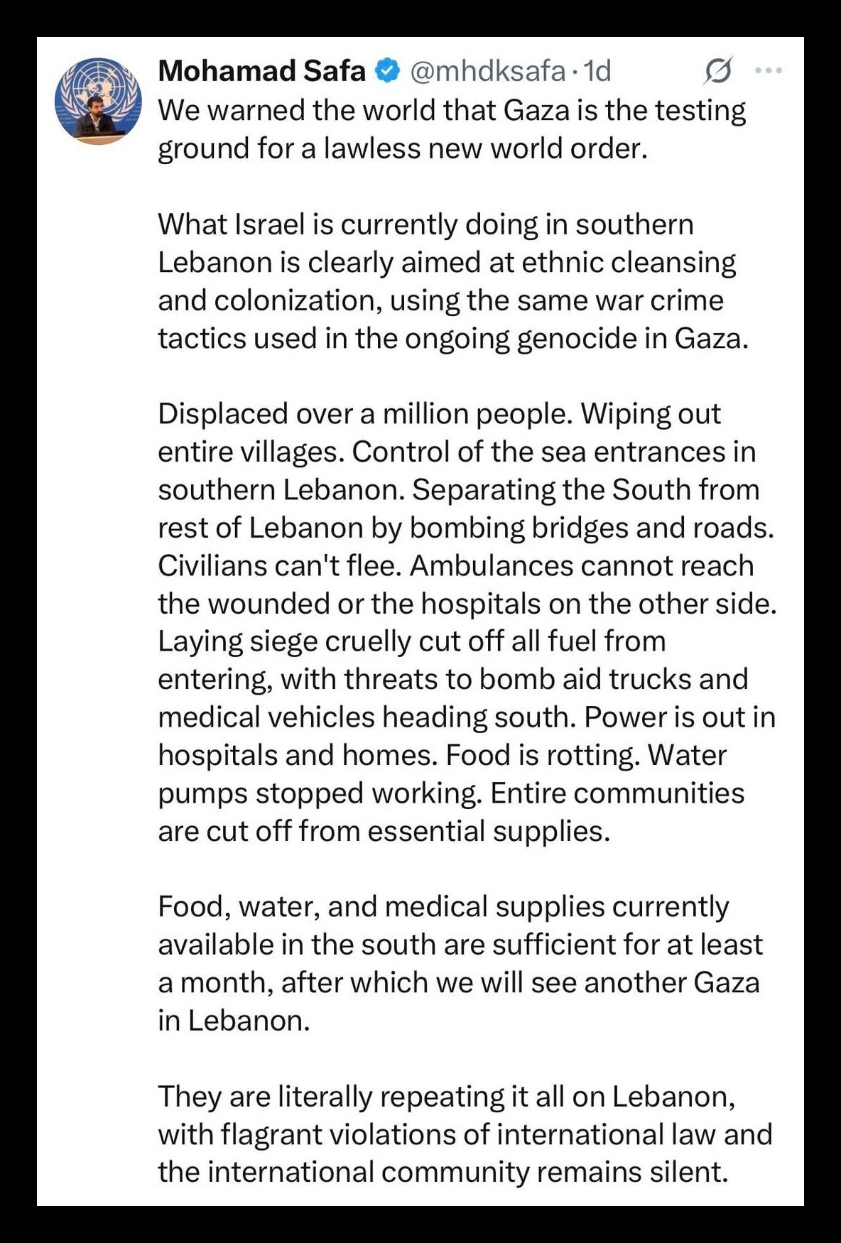 Mohamad Safa’s resignation should not be treated as just another diplomatic formality. He has walked away from a 12-year career inside the United Nations to refuse complicity in what he claims could lead to catastrophic consequences for millions of civilians. In his public statements, Safa asserts that the UN is systematically failing to uphold international law and human rights. He claims the organization refuses to properly characterise the events in Gaza Strip as genocide, refuses to label events in Lebanon as war crimes or ethnic cleansing, and ignores the legality of any potential war on Iran despite there being no imminent threat from Iran to world peace. He further alleges that the UN shields Israel and United States from accusations of violating international law under pressure from a powerful lobbying influence. Most alarmingly, Safa claims that the UN is preparing for the use of a nuclear weapon on Iran, stating bluntly, “the UN is preparing for possible nuclear weapon use.”
