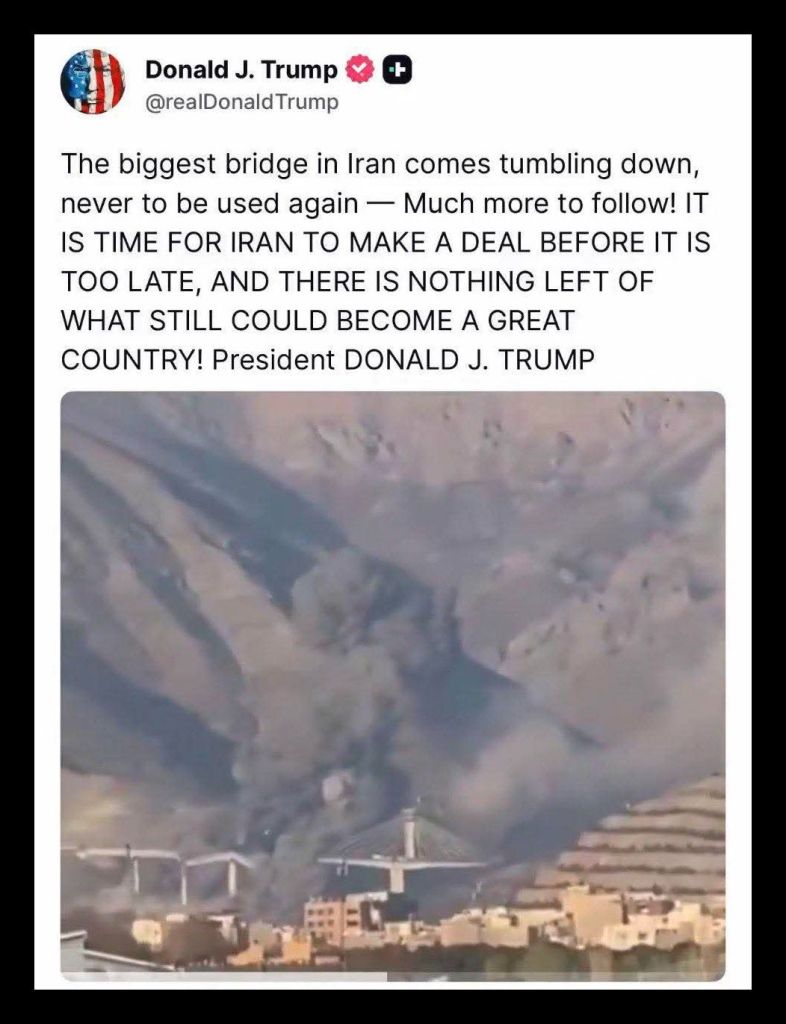 A strike on the B1 Bridge along the Tehran-Karaj northern bypass marks a documented expansion of targeting into civilian infrastructure with no established military function. The structure formed part of a major urban transport project designed to ease congestion across a metropolitan region of more than fifteen million people. On April 1, Donald Trump publicly stated that Iran would be brought “back to the stone ages,” and within twenty-four hours the bridge was struck twice, with the second impact occurring during active rescue operations. Video evidence shows emergency responders present between strikes, with casualties reported among civilians and rescue personnel.