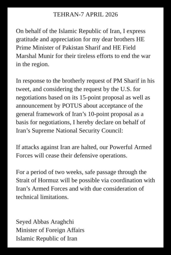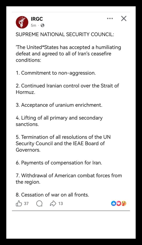 The war ended, fingers crossed, at the point where the United States accepted conditions it had rejected for four decades, and that moment marked a structural break rather than a negotiated settlement. Washington agreed to terms that reversed its established position on sanctions, enrichment, regional deployment, and maritime control, conceding outcomes previously treated as non-negotiable limits. The shift did not emerge from incremental compromise but from the exhaustion of available escalation pathways under conditions that no longer favoured continuation.
