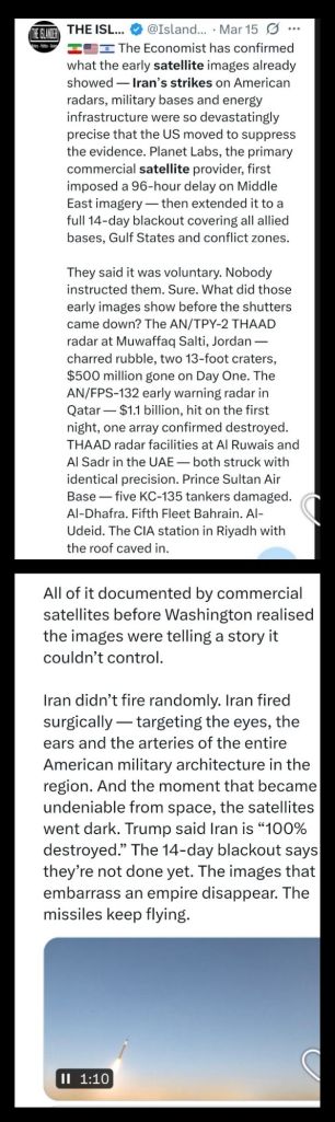 Reports from the Financial Times and Jane’s Defence Weekly indicate that Iranian precision strikes against U.S. and Israeli military infrastructure in the Gulf caused significant operational disruption, particularly at Prince Sultan Air Base in Saudi Arabia, where several KC-135 tankers and support facilities were damaged. Analysts noted that the strikes, coordinated with satellite-guided targeting systems, allowed Iran to maximize effect while minimizing Iranian personnel exposure. The global visibility of these strikes created such immediate concern that leading Western commercial satellite providers, including Maxar Technologies and Planet Labs, were reportedly instructed by U.S. authorities to limit the dissemination of high-resolution imagery to the public. As Thomas Karako of the Center for Strategic and International Studies explained, “The withholding of commercial satellite imagery demonstrates the psychological and strategic impact of Iranian strikes; these were not just attacks on physical assets, they were strikes on global perception and deterrence narratives.” The suppression of imagery highlights how Iran’s capability to observe, strike, and broadcast outcomes directly challenges Western control over the informational battlefield.